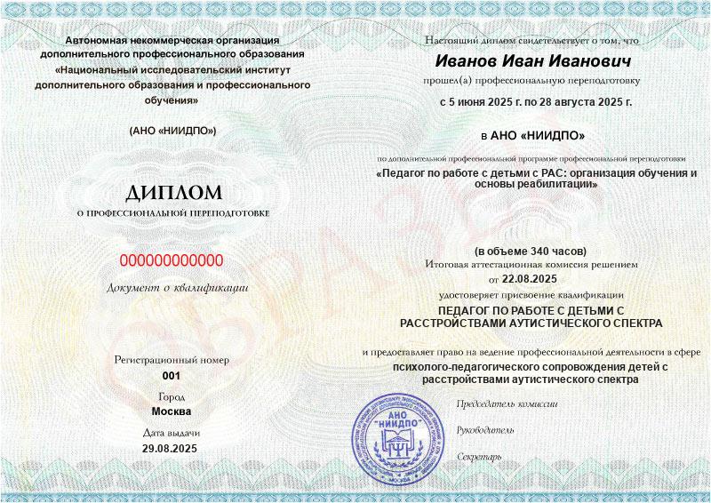 • Квалификация: Педагог по работе с детьми с расстройствами аутистического спектра