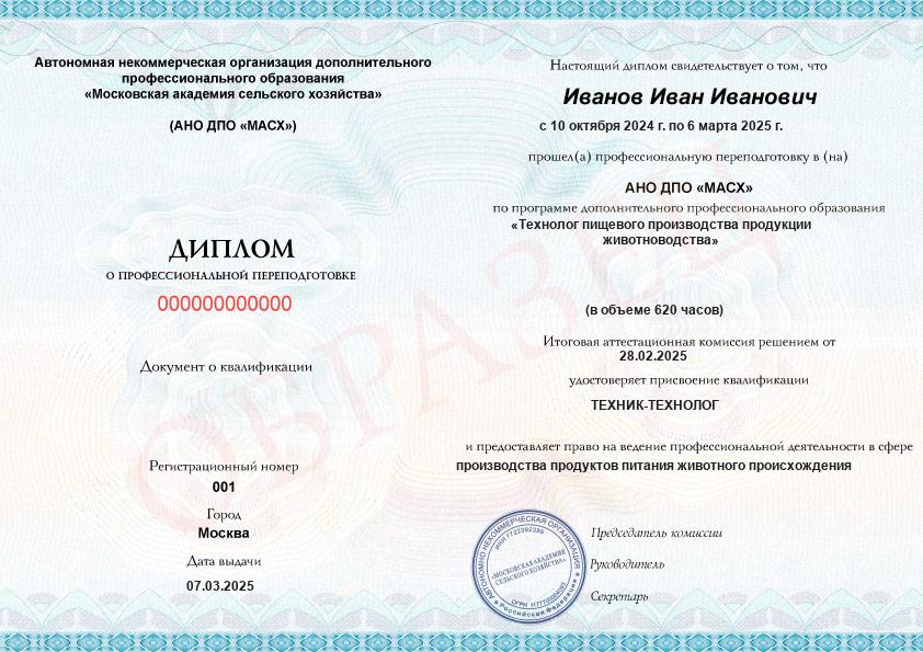 Технолог пищевого производства продукции животноводства (620ч)