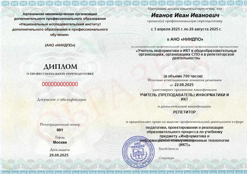 Обзор программы профессиональной переподготовки «Учитель информатики и ИКТ в общеобразовательных организациях, организациях СПО и в репетиторской деятельности» с присвоением квалификации «УЧИТЕЛЬ (ПРЕПОДАВАТЕЛЬ) ИНФОРМАТИКИ и ИКТ» с дополнительной квалификацией «РЕПЕТИТОР»