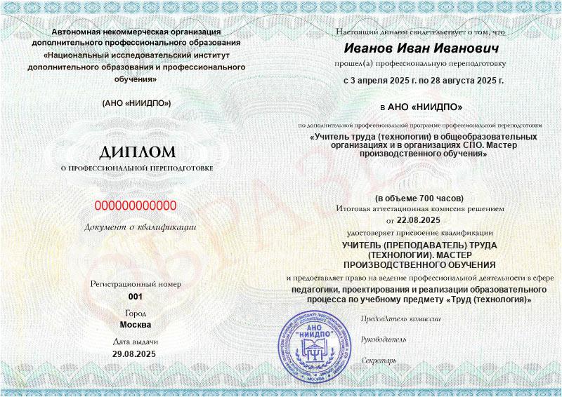 Учитель труда (технологии) в общеобразовательных организациях и в организациях СПО. Мастер производственного обучения (700ч)