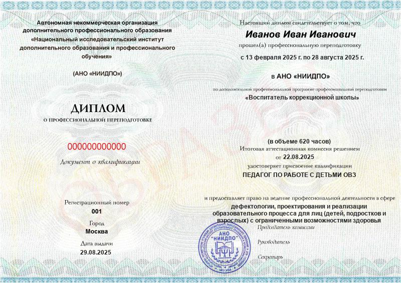 По окончании обучения вы получите квалификацию «Педагог по работе с детьми с ОВЗ» и диплом о профпереподготовке.