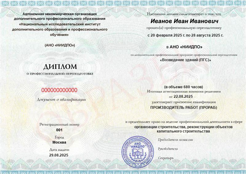 - Выдача диплома о профессиональной переподготовке с присвоением квалификации «Производитель работ (прораб)»